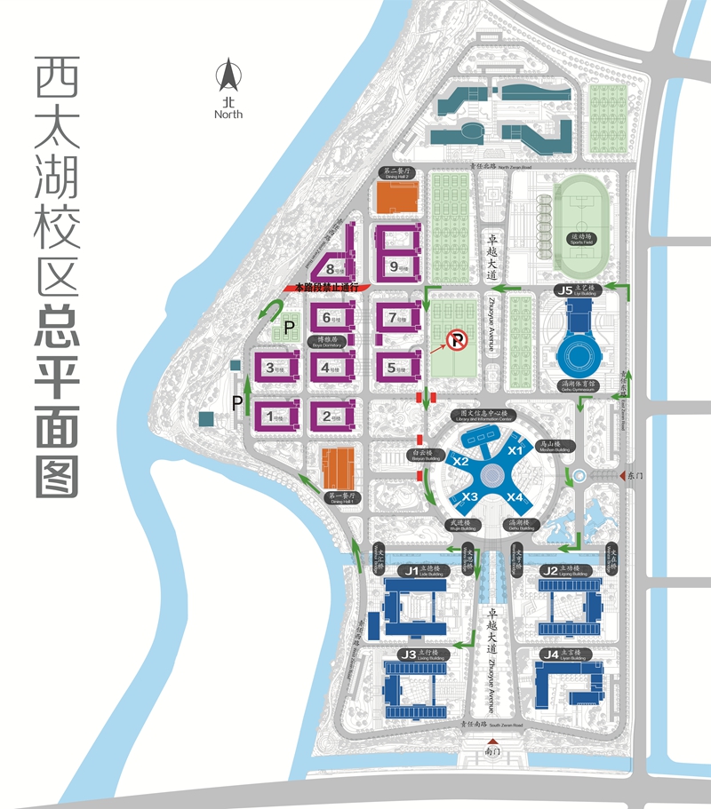 因8、9号楼基建施工需要,自2020年6月20日起,6号楼北侧道路路段全封闭施工,前往教学楼、餐厅、6号楼西侧临时停车场的车辆可按下图指示行驶,6号楼上班老师车辆可停放于7号楼北侧道路两侧或6号楼西侧临时停车场。老师可通过5、7号楼东侧南北向道路,往返教学楼,该道路路面较窄,请勿停放车辆并减速慢行。以上路段交通恢复时间约一个月,具体时间视基建施工进度提前通知。