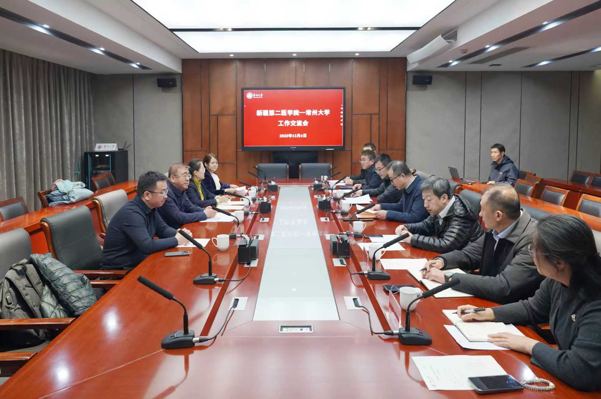 12 月 4 日上午,新疆第二医学院党委书记冯述江、党委常委、副校长徐培兰一行来校,围绕医工融合发展、人才培养协同等议题调研交流。校党委常委、副校长周刚出席交流会,党办校办、发展规划处、人事处、教务处、科技处及医学与健康工程学院相关负责人陪同。